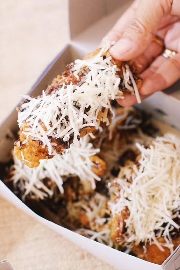 Pisang dengan susu dan parutan keju yang melimpah, perpaduan manis dan gurih yang bikin nagih!